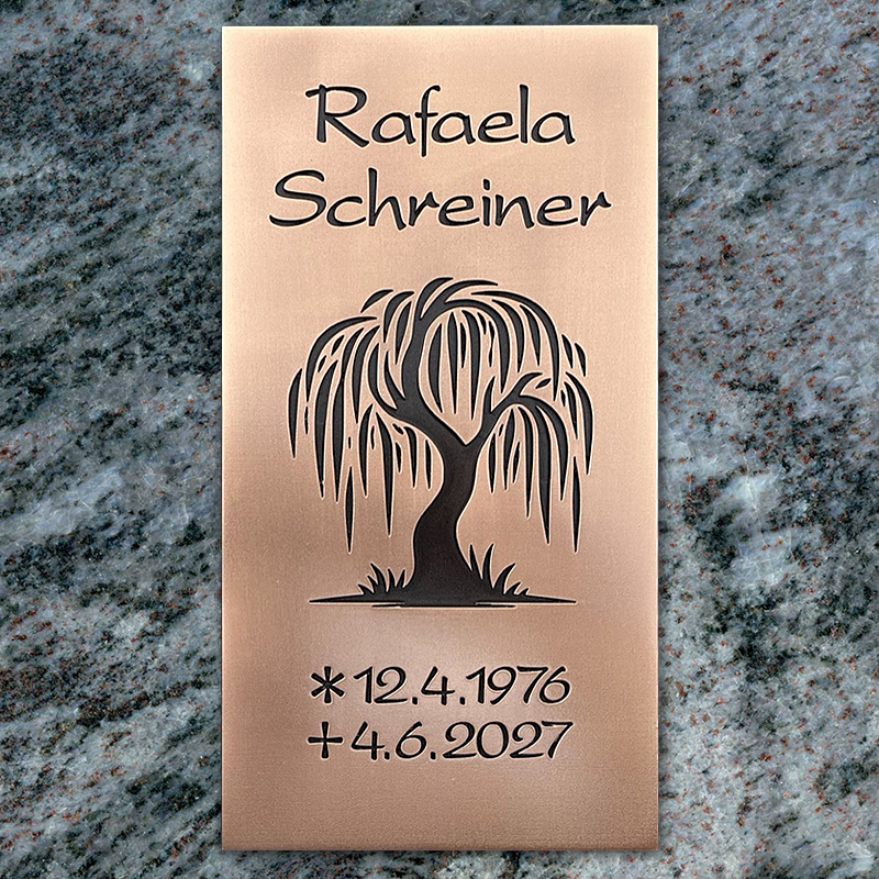 Schrifttafeln bzw. Gedenkplatten aus Metall (insbesondere Aluminium oder Bronze) werden häufig als Aufsatz- oder Reliefschrift auf Grabsteinen, Urnenwänden oder als separate Erinnerungs- bzw. Gedenktafeln verwendet — individuell gestaltbar mit Schrift, Ornamenten oder Symbolen.