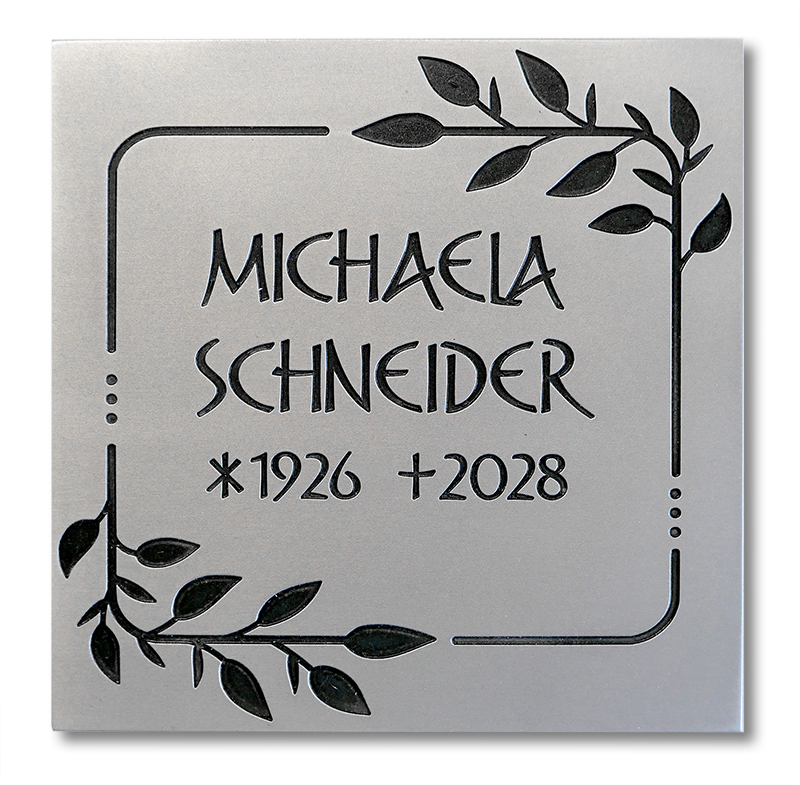 Die Beschriftung wird als vertiefte Gravur im hochwertigen CNC-Verfahren eingebracht. Vertiefte Schriften sind besonders beliebt, da sie die charakteristische Tiefe und Plastizität des Materials betonen. Aluminium eignet sich zudem sehr gut für präzise CNC-Gravuren oder fein ausgearbeitete Laserbeschriftungen. In dieser Phase werden auch Schriftart, Größe, Symbole sowie eventuelle Ornamente festgelegt. Moderne Verfahren ermöglichen eine exakte Übertragung der digitalen Gestaltung auf das Metall.